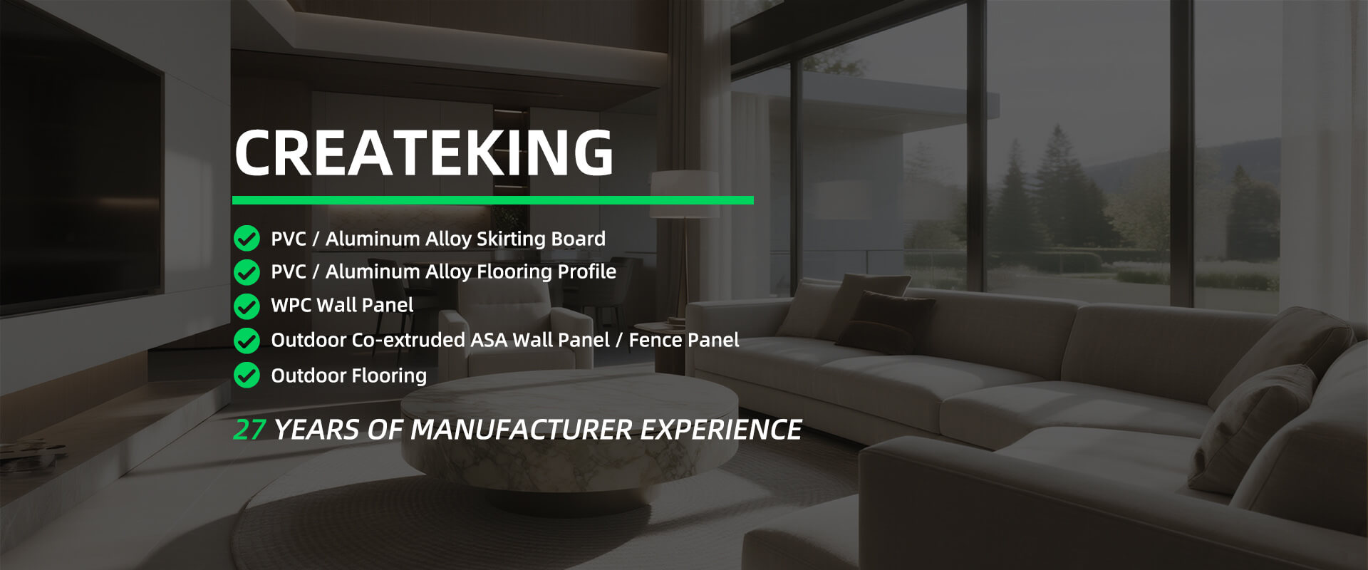 CREATEKING, founded in 2000, is a leading innovator in eco-friendly building materials with a strong focus on modern design and reliable performance. With advanced intelligent production lines, a skilled engineering team, and a creative design group, we continue to push new possibilities in wall and floor solutions. Our portfolio covers carbon crystal wall panels, integrated wall boards, WPC grilles, PVC and PS skirting, SPC flooring, and a full range of aluminium trims.